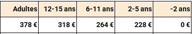 • Tarif 6-11 ans appliqué aux 12-15 ans si logement en chambre sans sanitaires.